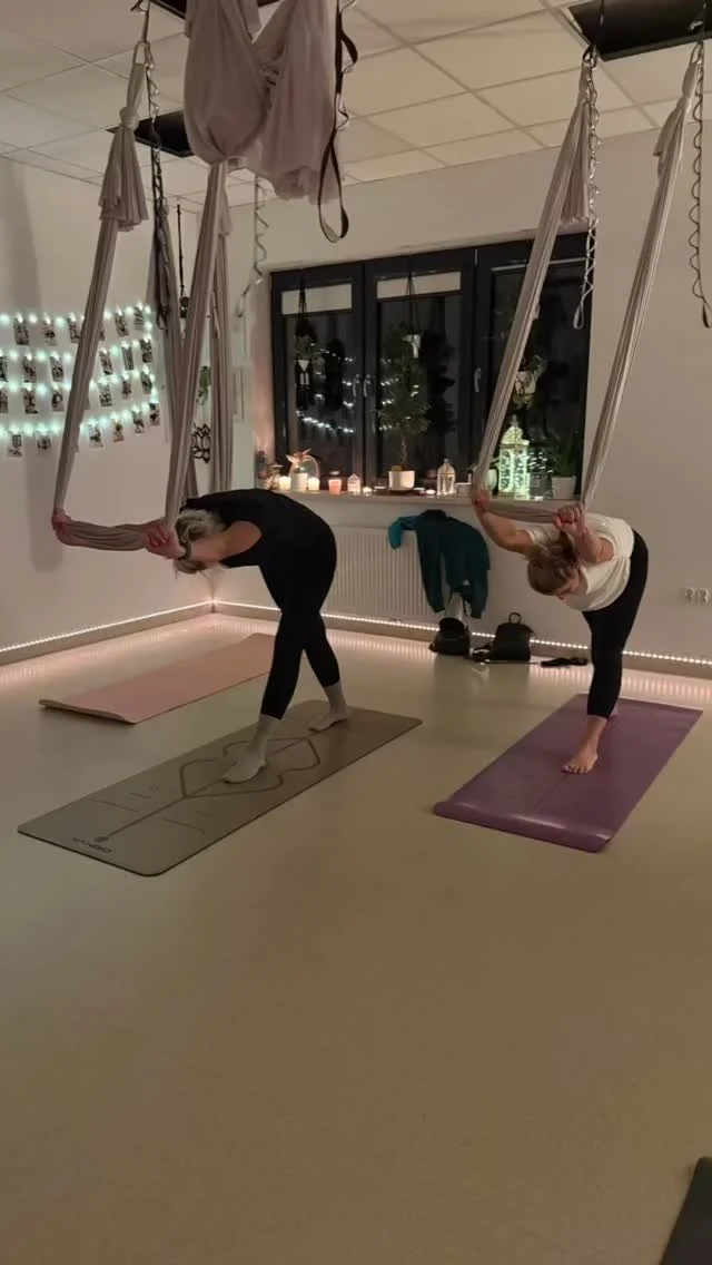 Joga na chustach (hamakach) umocowanych na suficie, która pozwala na ćwiczenie w powietrzu.
